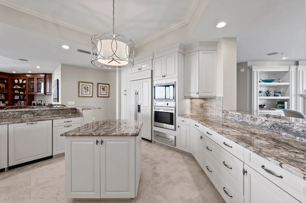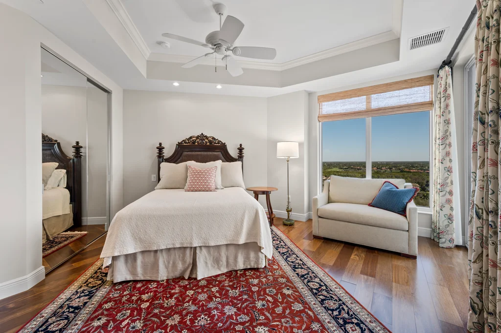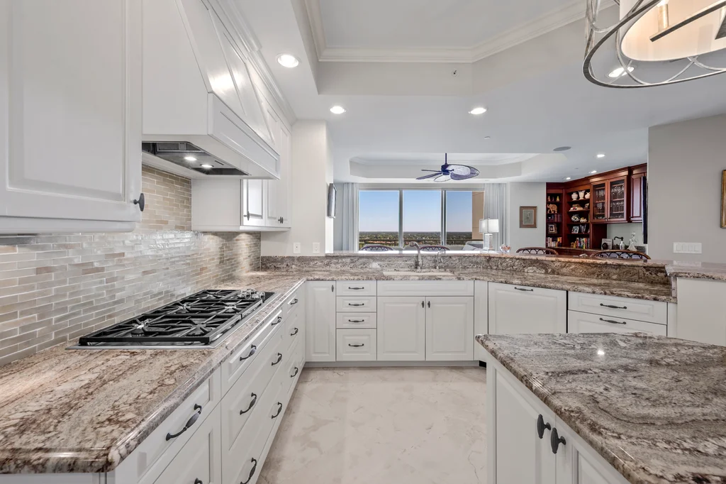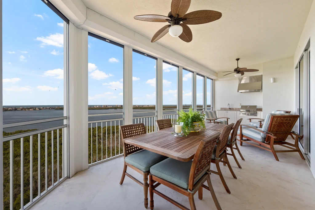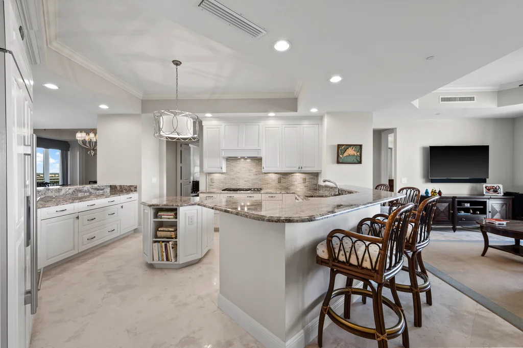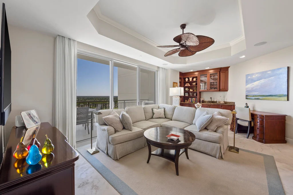 Experience refined high rise living in this beautifully appointed 15th floor residence in Tavira, one of Bonita Bay’s most coveted luxury towers. With sweeping, unobstructed views of the Gulf, Estero Bay, and the lush preserve canopy of the golf course below, this sanctuary offers a daily panorama of sunrises, sunsets, and shimmering water. A private elevator opens to an elegant foyer that leads into a spacious, light-filled great room framed by floor to ceiling glass. The open layout flows effortlessly to an expansive screened terrace—perfect for morning coffee or evening cocktails and grilling out. The gourmet kitchen features premium cabinetry, stone countertops, a large island, and top tier appliances and features a wine vault creating an ideal space for both everyday living and entertaining. The owner’s suite is a serene retreat with terrace access, dual closets and a spa inspired bath with separate vanities, soaking tub, and oversized shower. Two additional guest suites provide comfort and privacy, while a versatile family room offers space for an office, media room, or quiet escape. Residents of Tavira enjoy resort style amenities, including a rooftop terrace with breathtaking views, a resort pool and spa, state of the art fitness center, steam, sauna and massage rooms, theater, billiards, golf simulator room, guest suites, and an elegant club room for gatherings. Bonita Bay’s award winning community enhances the lifestyle with five championship golf courses, a private beach park, full service marina, pickleball, tennis, miles of walking and biking paths, and a vibrant social scene. A rare opportunity to own a high floor residence in Tavira—where luxury, nature, and coastal serenity come together in perfect harmony.