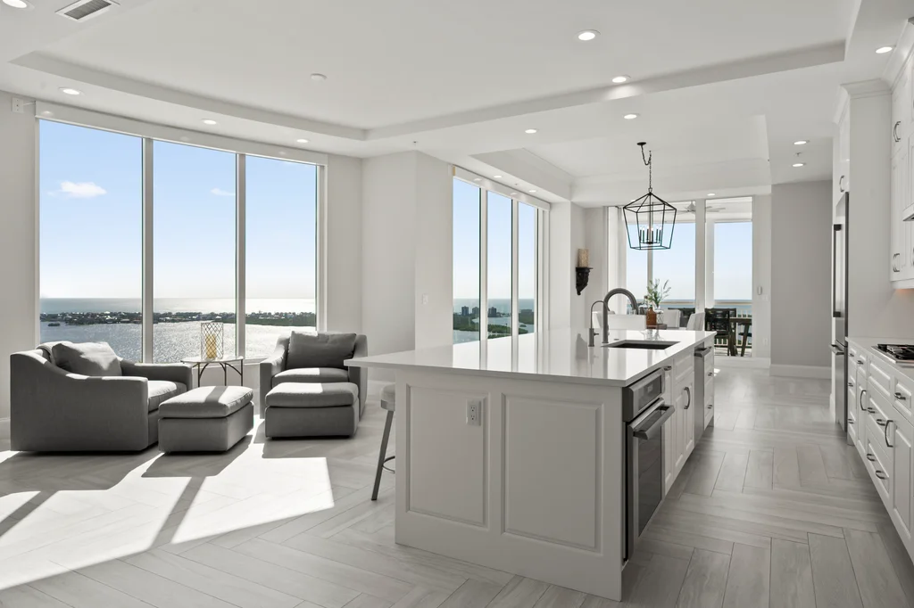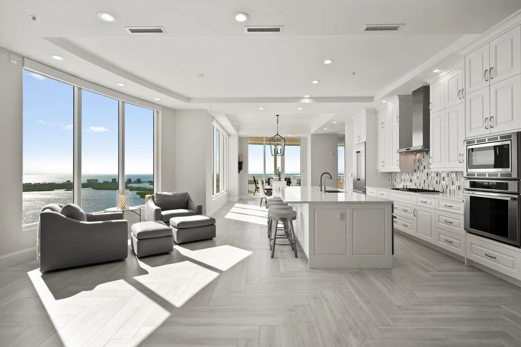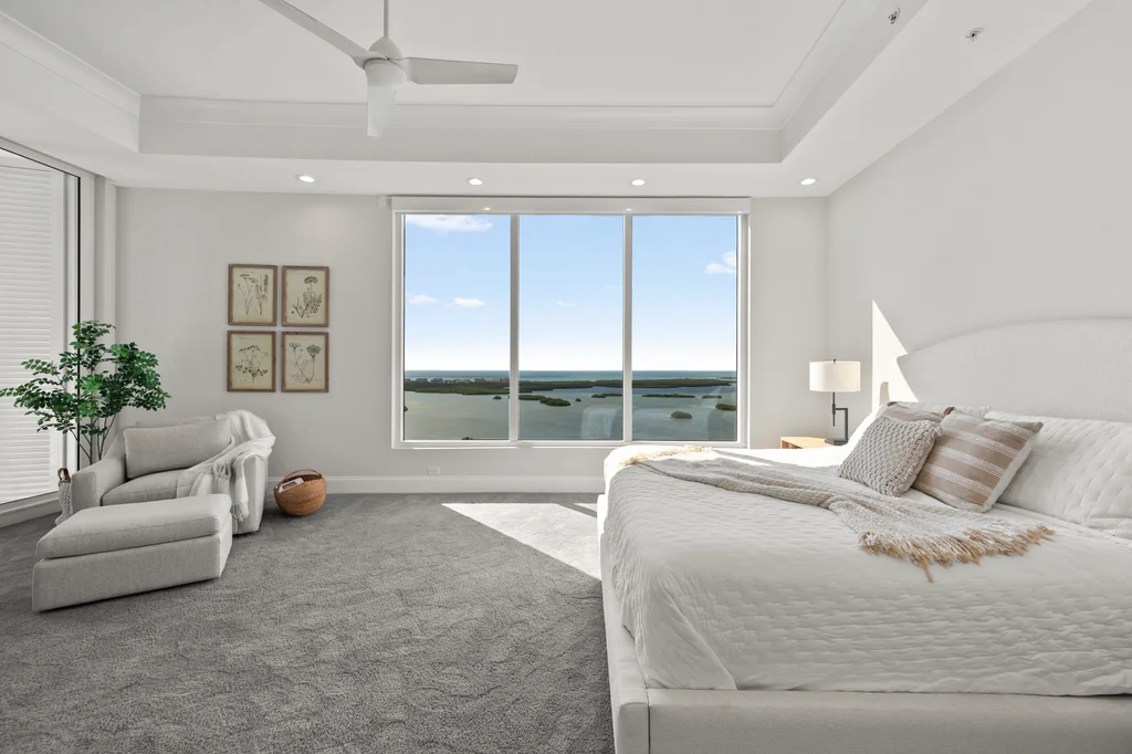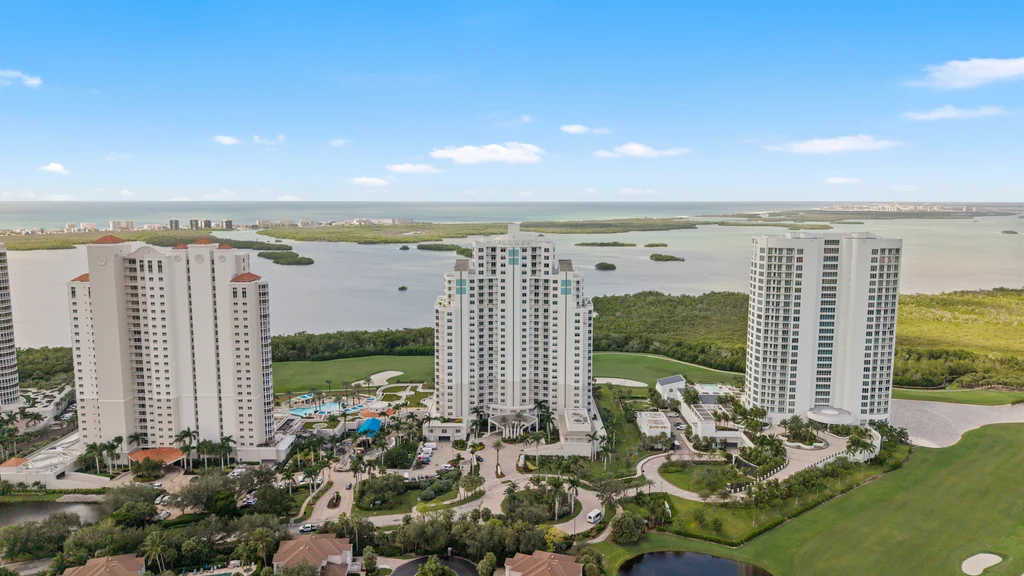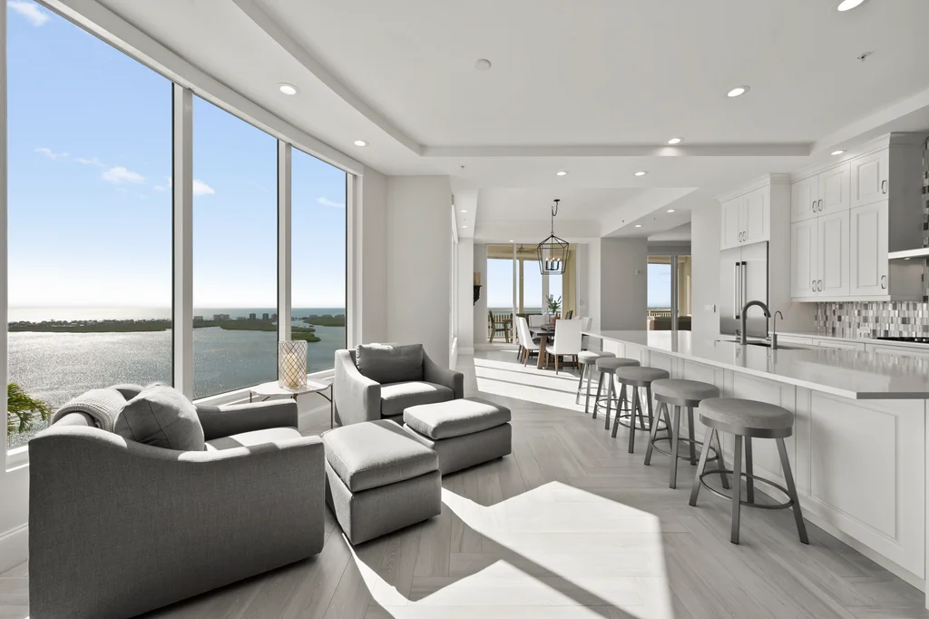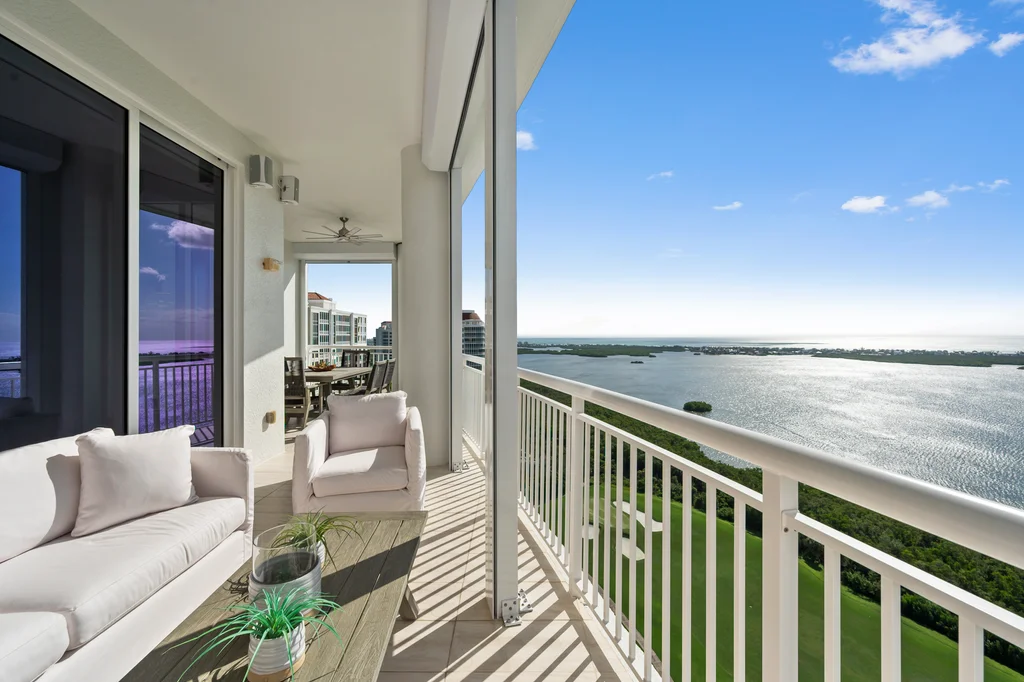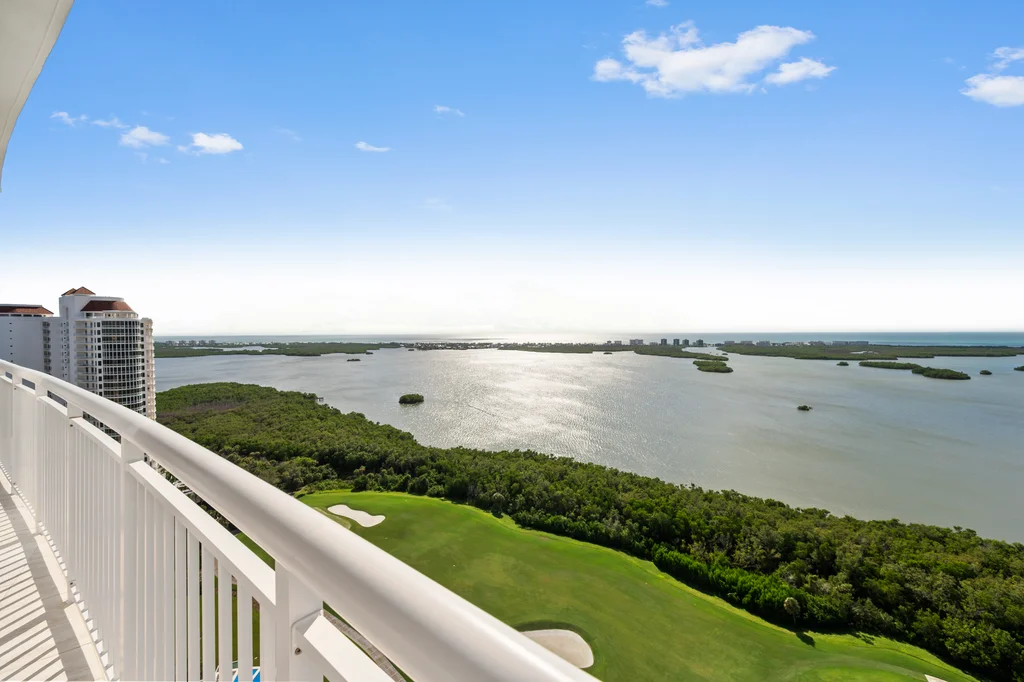 This stunning 25th-floor Penthouse offers breathtaking panoramic views of Estero Bay and the Gulf of America with a 2 1/2-car garage. Spanning approximately 4,590 square feet, this 4-bedroom, 5-bathroom condo is a masterpiece of modern design and elegance. The open-concept living area features floor-to-ceiling windows, showcasing natural light and the spectacular vistas. The chef's kitchen has top-of-the-line Thermador appliances, gas cooking, a wine chiller, double ovens, sleek cabinetry, and a spacious island perfect for entertaining. Each of the 4 bedrooms offers a private retreat, complete with en-suite bathrooms and fabulous views. While preparing dinner, step onto the expansive balcony with a gas grill to enjoy serene sunsets and gentle Gulf Breeze. Residents of Seaglass enjoy world-class amenities, including a resort-style pool, state-of-the-art fitness center, spa, and access to Bonita Bay's private beach club, golf courses, and marina. Located in the heart of Bonita Springs, this property offers the perfect blend of tranquility and convenience, with fine dining, shopping, and cultural attractions just moments away. Don't miss the opportunity to own a piece of paradise in one of Southwest Florida's most prestigious communities!