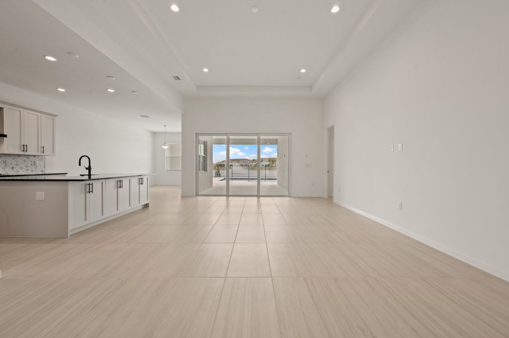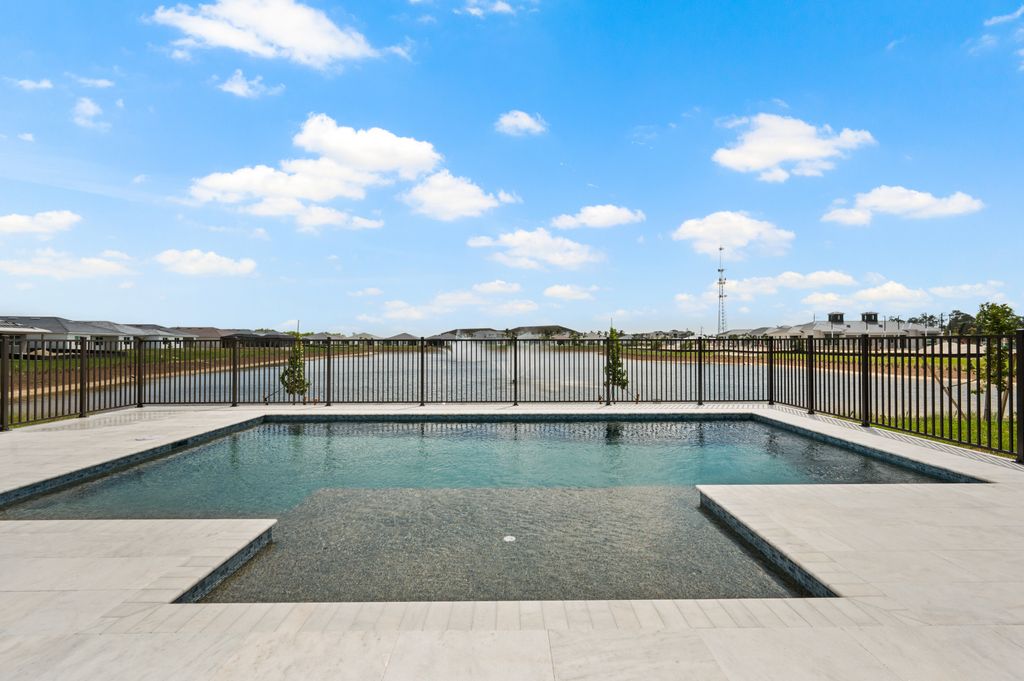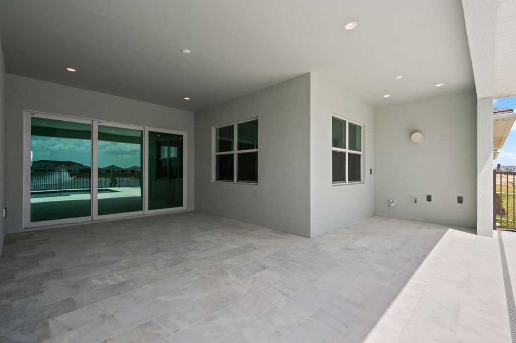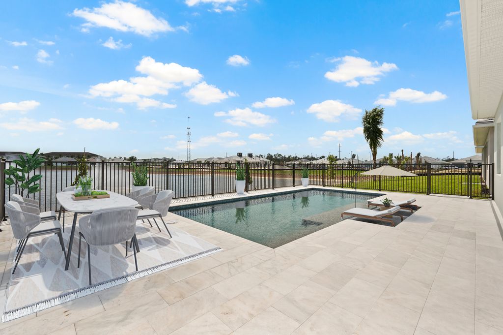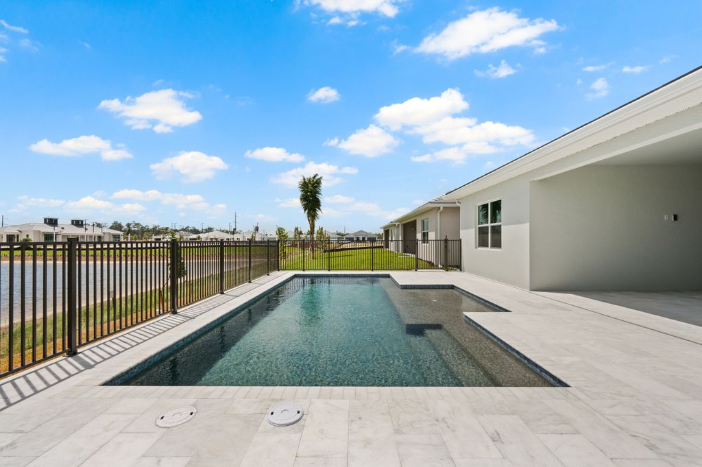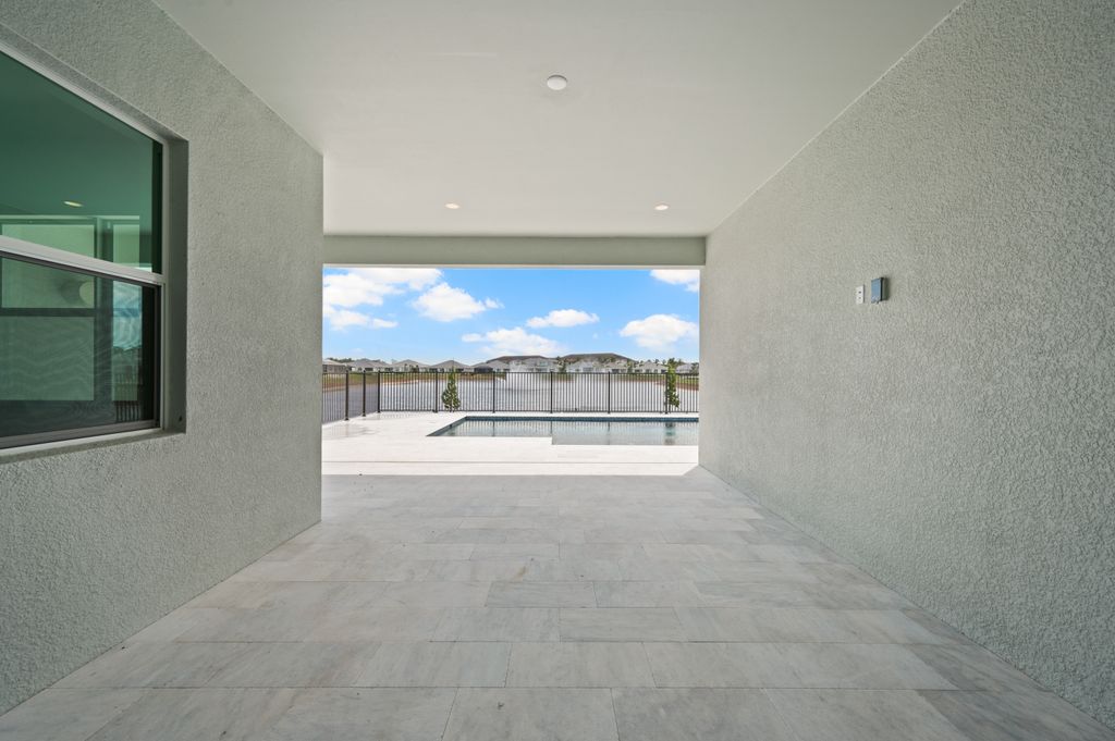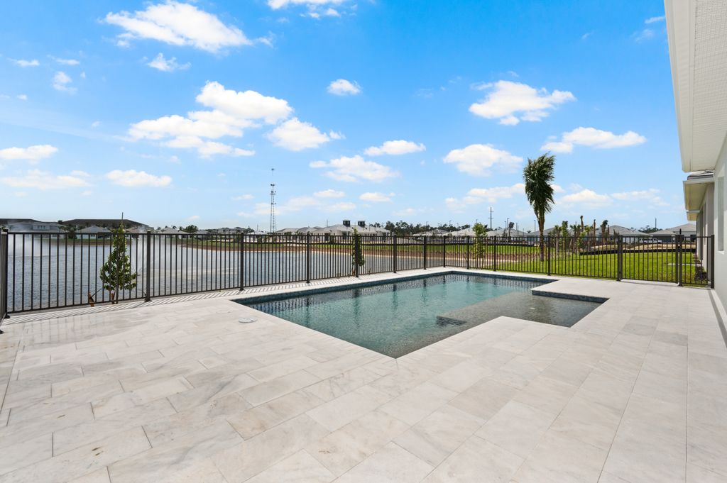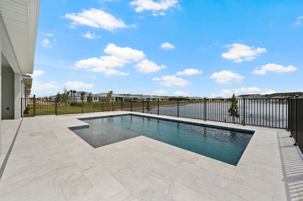 Heading outside, the lanai features a beautiful custom pool with a sun shelf and deck-level fountain jets. And the rear of this home faces south, the ideal direction for any home with a pool. This provides for all day Florida sunshine and warmth without the unforgiving direct sun intensity of eastern and western rear exposures. The home sits on a premium lake view lot; fountains provide a nice background soundtrack during the day. The lanai pavers are also upgraded. There is a plumb-in for a full outdoor kitchen with the all-important vent hood. And similar to the highest end homes in Naples, the lanai is gated as opposed to being caged. This allows for a much better rear view, as well as overall outdoor experience. And it eliminates cage maintenance issues including torn screening, as well as storm concerns.