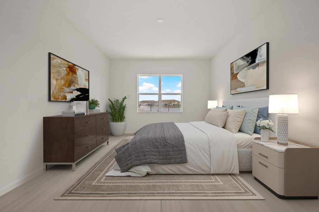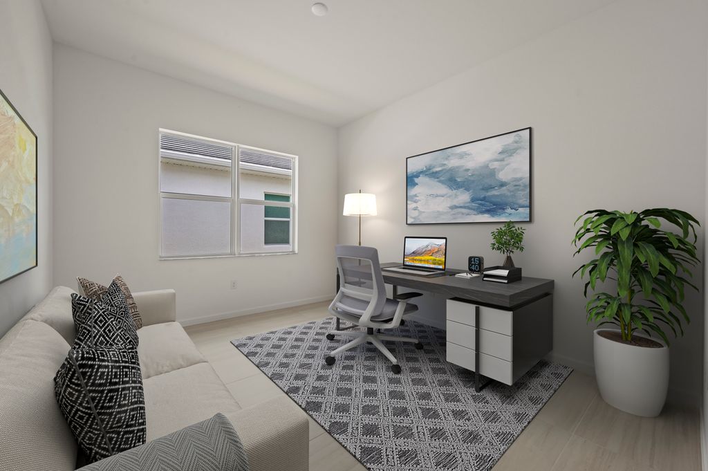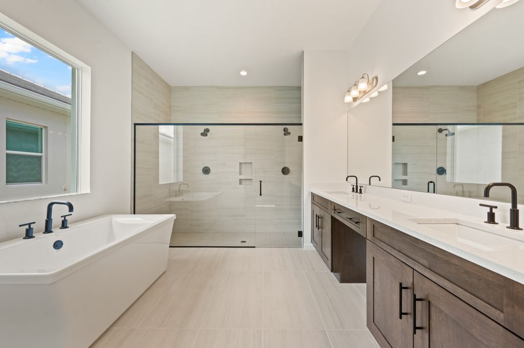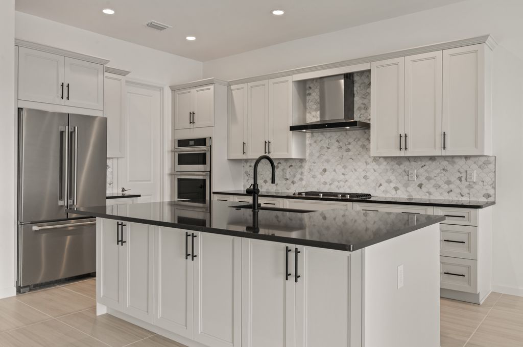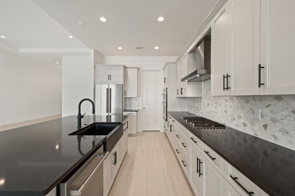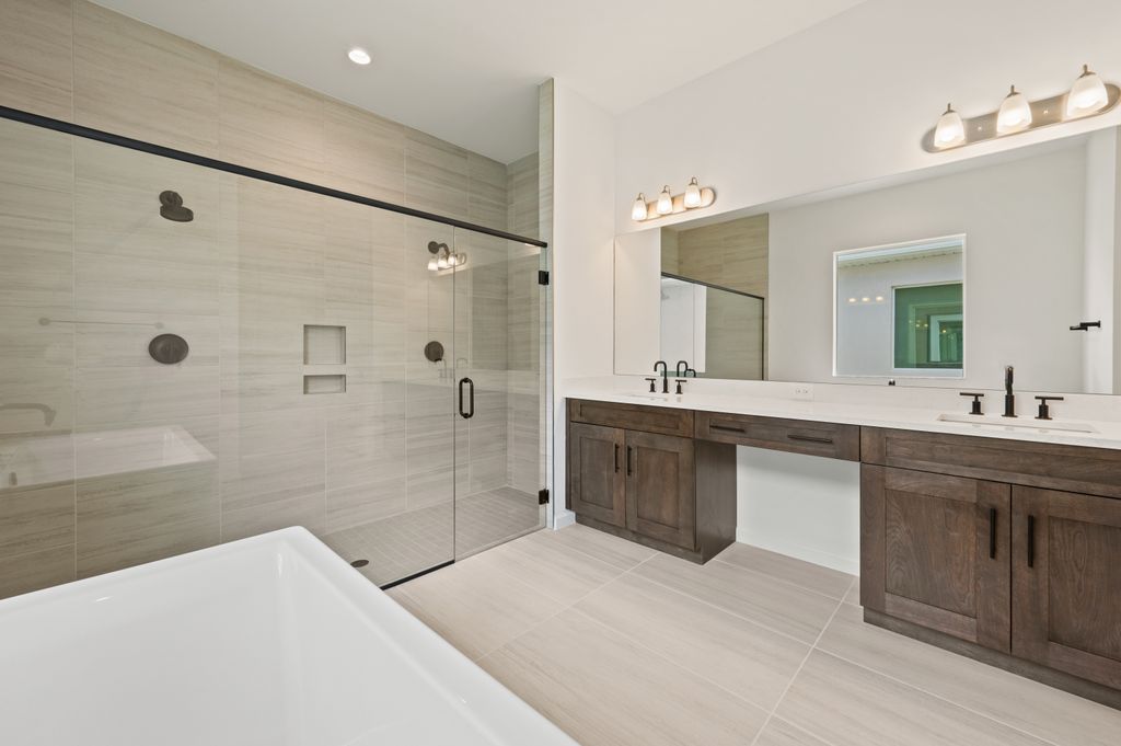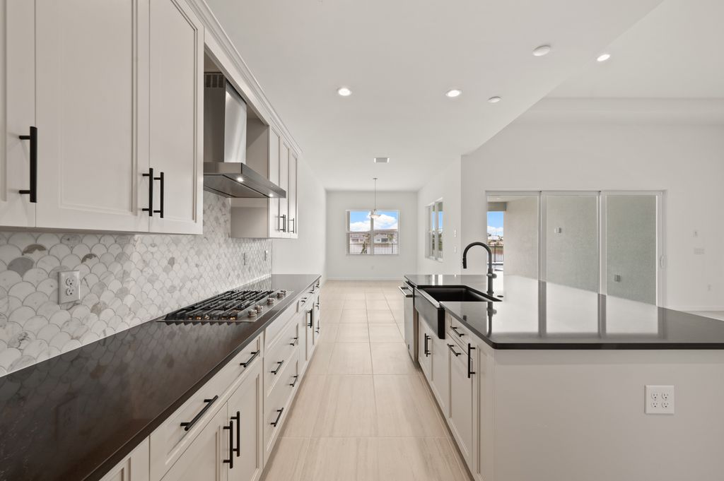 Highlights of this floor plan are 3 bedrooms, 2 bathrooms and a Powder Room. There is also a separate Flex Room that can serve as an office, den, crafts room or otherwise. The Great Room, features impressive 12' ceilings. Gorgeous upgraded porcelain tile flooring is throughout the entire home. The Master Bath includes a beautiful freestanding tub and oversized shower. All shower tiles extend the full height of each wall. The kitchen features a walk-in pantry with wood shelving and all appliances are upgraded to the highest package on offer. The cabinets are solid wood. The doors and drawers are soft-close. The countertops are a beautiful and highly durable quartz. The finishes are both modern and classic here. The kitchen is stunning.